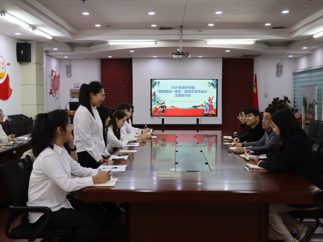 于4月8日在四号楼地下会议室召开2026年春季学期“民族团结一家亲,融情交流共成长”主题座谈会。会议由成人网址辅导员周子林主持,成人网址党委副书记屈广宁、校党委学生工作部(学生处、武装部)少数民族专职辅导员麦麦提伊敏·斯迪克及成人网址各年级辅导员出席,成人网址各年级学生代表参加。
